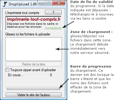 1- Téléchargez le programme sur votre ordinateur » DropUpLoad.exe : programme non compressé (lien conseillé) » DropUpLoad.zip : utilisez ce lien si votre connexion internet utilise un pare-feu ou un proxi susceptible de bloquer les fichiers ".exe". Une fois le fichier zip sur votre ordinateur, décompressez-le avant d'utiliser le programme. 2- Lancez le programme Double-cliquez sur le fichier : le programme s'ouvre et est prêt à fonctionner.
